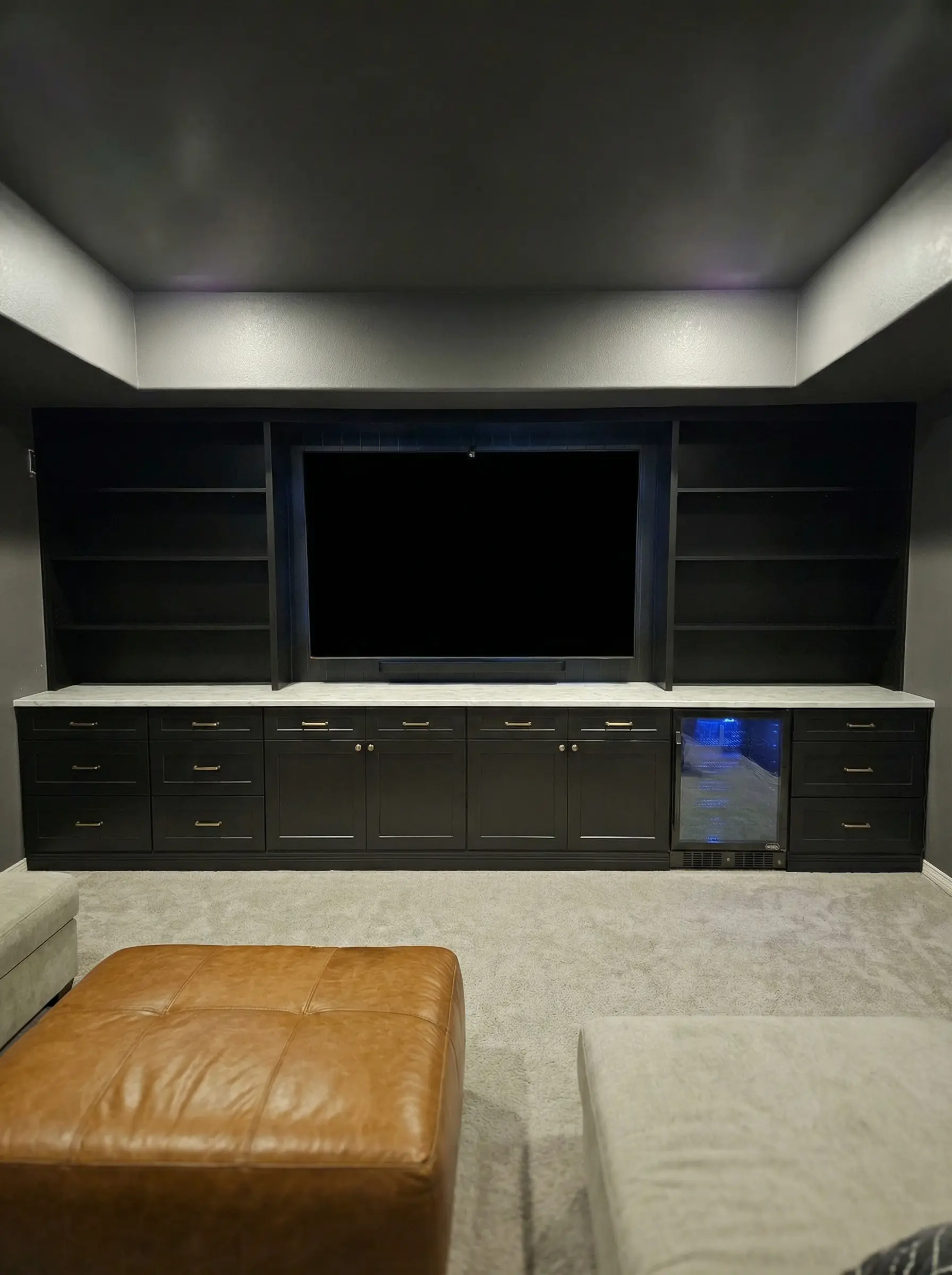 Fireplace built-ins, floating shelves, and custom media centers that anchor the room.