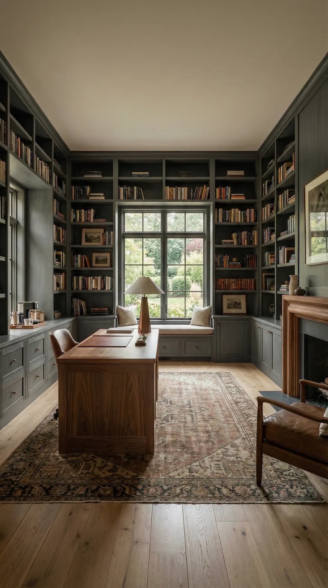 Executive desks, floor-to-ceiling bookshelves, and productivity spaces.