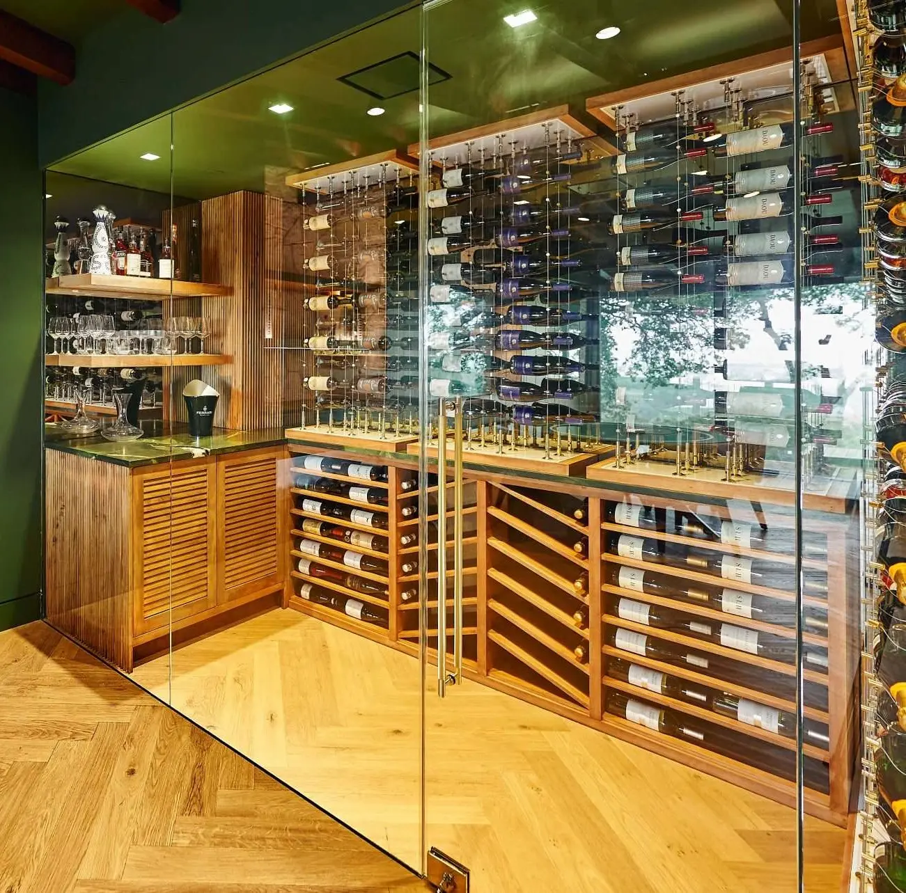 Climate-controlled wine cellars, wet bars, and entertainment millwork.