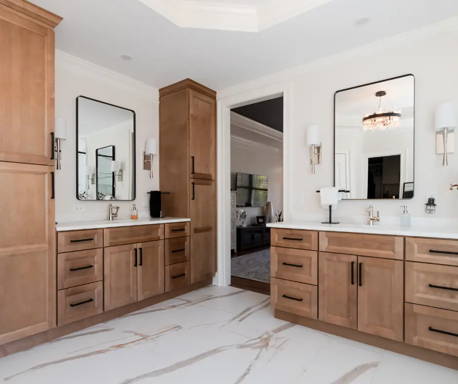 Floating vanities and linen storage designed for moisture resistance and elegance.